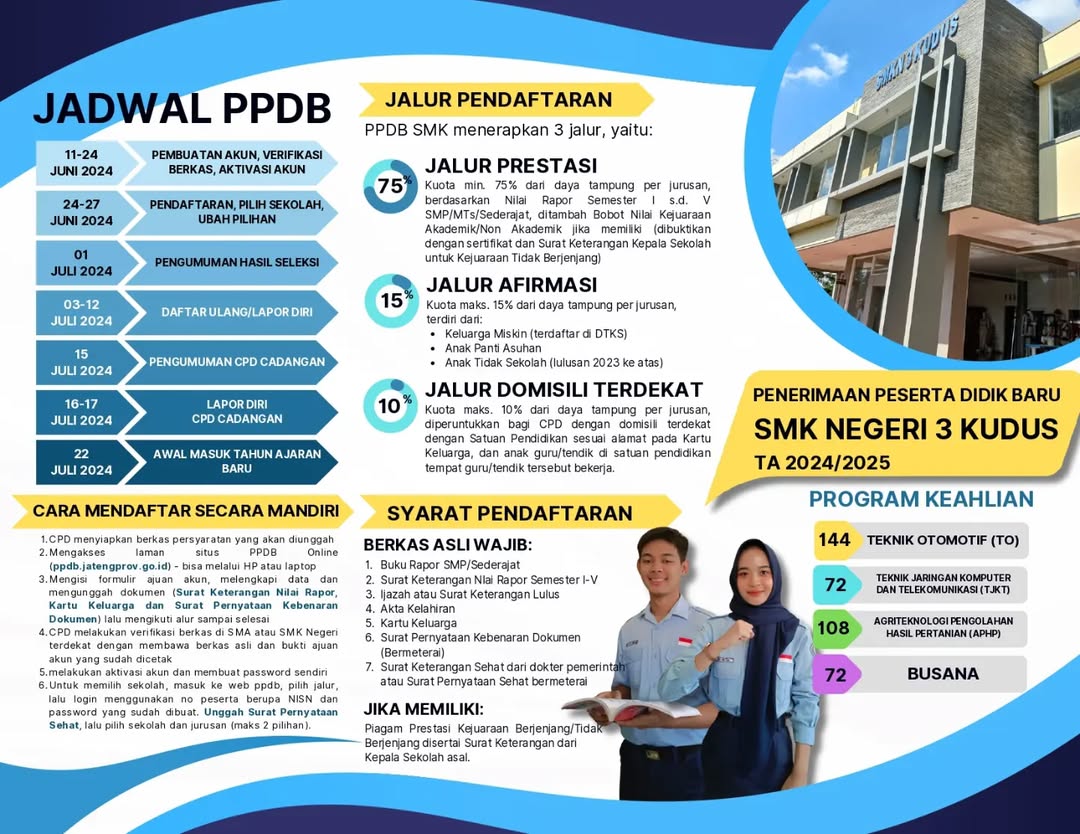Blog PPDB SMKN 3 Kudus 2024/2025 admin Juni 8, 2024 2:30 pm Bagikan : Facebook X Telegram WhatsApp PrevSebelumnyaSeragam SMKN 3 Kudus hari Senin-Jumat SelanjutnyaSelamat Ulang Tahun SMKN 3 Kudus ke 17Next Postingan lainnya Rekapitulasi Realisasi Penggunaan Dana BOS Tahap 2 2025 Baca selengkapnya » 23 Januari 2026 Kegiatan Sekolah Upacara Peringatan Hari Ibu 2025: SMK Negeri 3 Kudus Baca selengkapnya » 22 Desember 2025 Kegiatan Sekolah Pembinaan Karakter Serentak Orang Tua dan Murid Menuju Keluarga Bahagia Baca selengkapnya » 18 Desember 2025 Berita Terbaru Rekapitulasi Realisasi Penggunaan Dana BOS Tahap 2 2025 Upacara Peringatan Hari Ibu 2025: SMK Negeri 3 Kudus Pembinaan Karakter Serentak Orang Tua dan Murid Menuju Keluarga Bahagia TEKNO KARYA SMK 2025: Sinergi Kreasi, Teknologi, dan Kearifan Lokal untuk Masa Depan Berkelanjutan Proses Mudah Pengurusan Surat Keterangan Siswa di SMK Negeri 3 Kudus Realisasi Penggunaan Dan BOSP Sosialisasi tentang KenakalanRemaja dan Narkotika dari POLSEK Undaan MPLS Busana