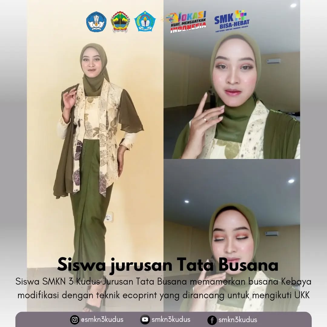 Siswa SMKN 3 Kudus Jurusan Tata Busana memamerkan busana Kebaya modifikasi dengan teknik ecoprint yang dirancang untuk mengikuti UKK.